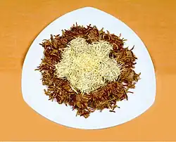 Danja is made by steaming glutinous rice flour in a siru (steamer), pounding the steamed tteok, shaping it into chestnut-sized balls with various coatings that are sweetened with honey, and coating the balls with honey followed by powdered or shredded ingredients. Common fillings are finely chopped gyulbyeong (Mandarin orange boiled in honey), cooked and sieved chestnuts mixed with cinnamon powder and honey, and geopipat-so (white, dehulled red bean paste) mixed with cinnamon powder and honey.[3] Common coatings are cooked with sieved chestnuts, shredded jujubes, chopped pine nuts, cinnamon powder, and toasted sesame seeds.[3]