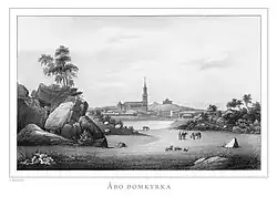 On 2–3 August, the Danish forces under the command of Otto Ruud (spelled Otto Ruuth in the chronicle) snuck past the castle guards unnoticed while everyone else was asleep and sailed up the Aura River, eventually reaching Åbo.[6] They spread out through the city, and eventually with a "horrible noise and with a terrible sound of drums and piercing trumpets" woke everyone up, in order to induce panic according to Bishop Juusten's chronicle.[6][7] Once inside, they plundered the town, and killed the people inside and anyone who resisted, along with the more important people there. They most likely attacked the town's cathedral first, stealing the bishop's mitre, crosier, as well as books, copper, tin, iron, and items of all kinds.[7][8] It is also probable that Ruud, along with elite troops, took the task of taking the richest treasure chamber.[6] The Danes also kidnapped several of the residents, taking them back to Copenhagen.[6][7] Otto Ruud would also stay in Åbo until Tuesday, taking more of the town's goods and putting them on his ships. The ornaments on the cathedral were also taken. Despite the chronicle's young age in comparison to the event, the main details have been confirmed by contemporary sources.[7]