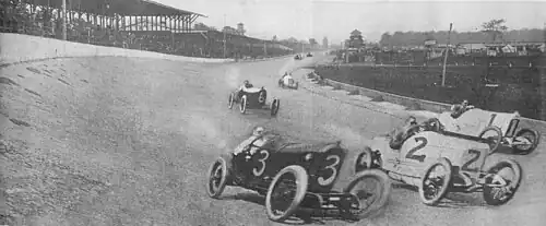 In early 1915 Resta was brought to the United States by Alphonse Kaufman, an America importer of Peugeots, to drive Kaufman's Peugeot EX3. In January he married Mary Wishart, the sister of racer Spencer Wishart who had died the previous year.[2][3] In February he won the United States Grand Prix, more properly named the United States Grand Prize, at San Francisco followed by a victory in the Vanderbilt Cup. After leading during the final stages of that year's Indianapolis 500, he finished second to Ralph DePalma when his car skidded and he had to make a pit-stop for tyres. Resta then drove his blue Peugeot to victory in the inaugural 500-mile (800 km) race on the board track at the Chicago Speedway on 26 June 1915.[4] The race received eighteen pages of coverage in the 1 July 1915, issue of Motor Age magazine.