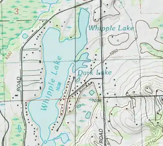 The other lake covers 7 acres (2.8 ha), with a depth of 12 feet (3.7 m). It connects to Whipple Lake on its east side.[2]