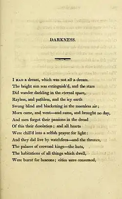 "Darkness" is a poem written by Lord Byron in July 1816 on the theme of an apocalyptic end of the world which was published as part of the 1816 The Prisoner of Chillon collection.