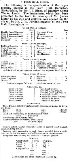 By 1903 the public hall was adorned with a fine new pipe organ, a gift to the town from the widow of James Slater, an ex-chairman of the local board, in his memory. The instrument was built by the West Yorkshire firm of J. J. Binns and was fully reported in the Musical Times.[9] The organ is still in use.[10] In June 2018 the Darlaston Town Hall pipe organ was recognised of outstanding national importance by the British Institute of Organ Studies (BIOS) – the UK's amenity society for pipe organs – and is listed as Grade 1 in the UK Historic Organs Scheme for being: an unaltered example of a town hall organ of 1903 by J. J. Binns and from the firm’s finest period.[11]