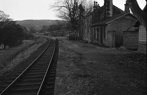 The station consisted of a single platform without a passing loop, a four-bedroom stone house for the station master and his family, with an adjoining booking office and waiting room. For some reason the design of the station was far simpler than the buildings designed by the NER Architect Thomas Prosser for Ripley, Birstwith, Dacre and Pateley Bridge. At a later date a separate ladies' waiting room and WC, and an outside gents' urinal and WC, were added at the Pateley Bridge end of the buildings. There were two small timber buildings on the platform: a lamp room, and a goods warehouse, essentially a lock-up shed. In the yard were two sidings, reached via a single connection from the main running line. A small three-sided timber shelter on the platform provided cover for the 6-lever signal frame, which operated the connection to the goods yard and the running signals. There was a 5-ton hand crane and a short timber loading stage, but no facilities for coal (unlike many NER stations). There was also a platelayers' hut and a wash house for the station master and family. At the exit from the yard there was a stone-built weigh house with a 12-ton weighing machine. At the Birstwith end of the yard was a pair of brick semi-detached cottages of a standard NER design.[7][8]