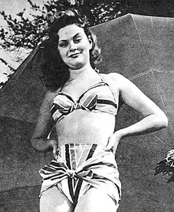 During World War II, Kennedy became a minor pin-up figure. Her image was widely circulated in publications catering to U.S. soldiers. In one 1943 article, she appeared nearly nude on a faux “iceberg” in response to a Pacific Theater request for “the girl we would most like to warm our iceberg.”[8]