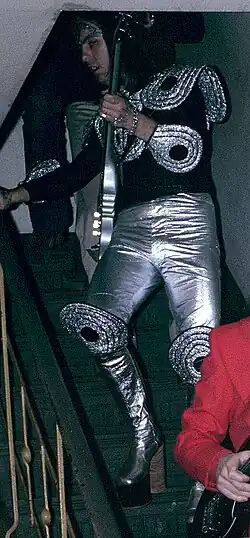 [H]e usually wore a jumpsuit made of the foil that you baste your turkeys in and platforms of oil-rig-derrick height. All of this though paled in comparison with his coiffure, a sort of demented tonsure with a great scooping fringe. He even had one outfit around 1973 famously called his 'Metal Nun' suit but later styles were much toned down.[15]