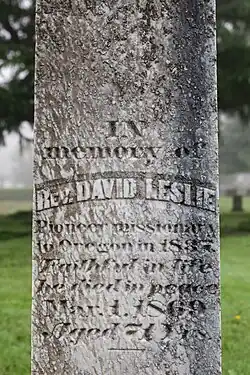 After the closing of the Methodist Mission in Salem, David Leslie received the land in what is now between Bush's Pasture Park and the Willamette River, and McGilchrist and Mission streets in Salem.[1] On that land he grew apples and pears, and built the fourth house in the city.[1] In 1845, he was elected as the president of the board of trustees at the Oregon Institute, and he held that role until his death.[1] During this time Oregon Institute would become Willamette University, and Leslie laid the cornerstone for Waller Hall that still stands today as the oldest building on Willamette’s campus.[1]