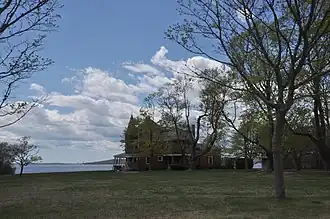 Gardner's Neck is a peninsula projecting southward into Mount Hope Bay between the Cole and Lee Rivers on Swansea's south coast. The David M. Anthony House is located on a large parcel at the center of the peninsula's southern shore, which includes its very southernmost tip. The house is a 2+12-story wood-frame structure, with asymmetrical massing typical of the Queen Anne period. It has a hip roof with cross gables, and porch that wraps around the waterfront side to the east. The exterior is finished in a combination of wooden shingles and clapboards.[2]