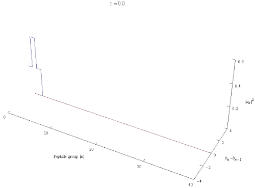 Quantum dynamics of a Davydov soliton with pN generated by an initial Gaussian step distribution of amide I energy over 3 peptide groups at the N-end of a single α-helix spine composed of 40 peptide groups (extending along the x-axis) during a period of 125 picoseconds. Quantum probabilities of amide I excitation are plotted in blue along the z-axis. Phonon lattice displacement differences (measured in picometers) are plotted in red along the y-axis. The soliton is formed by self-trapping of the amide I energy by the induced lattice distortion.[1][2]