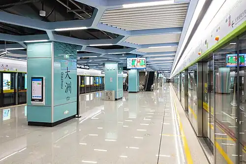 Dazhou Station (Chinese: 大洲站; pinyin: Dàzhōu Zhàn; Jyutping: daai6zau1 zaam6) is a station of Guangzhou Metro Line 7, located underground within Dazhou Village on Dazhou Road in Guangzhou's Panyu District.[1] The station was opened on 1 May 2022, with the opening of the western extension of Line 7.[2][3][4] This is the last station on the line westbound before it enters Foshan's Shunde District.