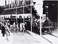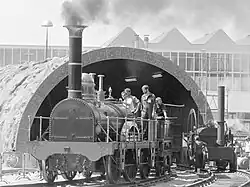 In the summer of 1939, the Arend drove around the exhibition grounds for the Dutch railway centenary at Frederiksplein in Amsterdam. For ten cents, people could ride two round trips. At least 100,000 people did so; the train covered about 3,000 kilometres (1,900 mi) on the grounds.[2] Afterwards, the locomotive was stored in a shed near the workshop in Zwolle. There the replica survived the destruction of Zwolle yard in 1945 by a German Sprengkommando.[2][3]