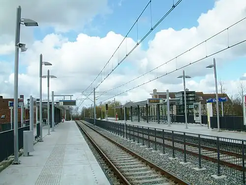 The station has two platforms. They are at the same level as the doors of the trams that it serves, so that passengers can board and alight without having to negotiate a step.