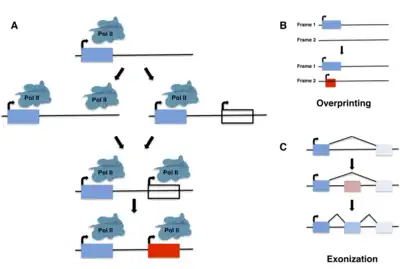 In the same year, however, Pierre-Paul Grassé coined the term "overprinting" to describe the emergence of genes through the expression of alternative open reading frames (ORFs) that overlap preexisting genes.[13] These new ORFs may be out of frame with or antisense to the preexisting gene. They may also be in frame with the existing ORF, creating a truncated version of the original gene, or represent 3’ extensions of an existing ORF into a nearby ORF. The first two types of overprinting may be thought of as a particular subtype of de novo gene birth; although overlapping with a previously coding region of the genome, the primary amino-acid sequence of the new protein is entirely novel and derived from a frame that did not previously contain a gene. The first examples of this phenomenon in bacteriophages were reported in a series of studies from 1976 to 1978,[14][15][16] and since then numerous other examples have been identified in viruses, bacteria, and several eukaryotic species.[17][18][19][20][21][22]