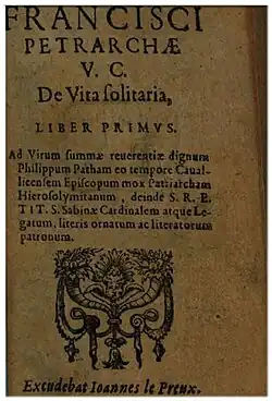De vita solitaria ("Of Solitary Life" or "On the Solitary Life"; translated as The Life of Solitude) is a philosophical treatise composed in Latin and written between 1346 and 1356 (mainly in Lent of 1346) by Italian Renaissance humanist Petrarch. It constitutes an apology of solitude dedicated to his friend Philippe de Cabassoles.[1][2]