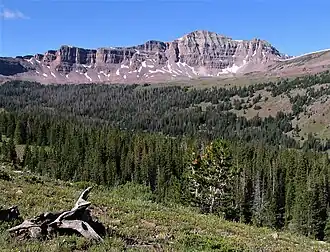 Dead Horse Peak is set within the High Uintas Wilderness on land managed by Ashley National Forest and Uinta-Wasatch-Cache National Forest. It is situated along the crest of the Uinta Mountains which are a subset of the Rocky Mountains, and it ranks as the 50th-highest summit in Utah.[2] Topographic relief is significant as the southwest aspect rises 1,550 feet (470 meters) in less than one-half mile and the summit rises nearly 2,000 feet (610 meters) above Dead Horse Lake in one mile. Neighbors include Explorer Peak three miles to the southeast, Mount Beulah 3.5 miles north, and line parent Yard Peak is 1.5 mile northwest. Precipitation runoff from this mountain drains north to the Blacks Fork and south into headwaters of Rock Creek which is a tributary of the Duchesne River.