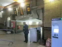A deputation from the Improvement Committee duly met directors of the railway to urge them to improve the "dingy" and "long-neglected" station.[24] Improvement plans were drawn up but an impasse was reached; the MSJAR's joint owners (the L&NWR and the MS&LR) disagreed on how much they should spend on improvement[25] and Manchester Corporation were unhappy with any narrowing of adjacent streets to accommodate an enlarged station.[26] Not until 1892 was a plan devised that was acceptable to all of the interested parties.[27] Negotiations to purchase the required land were protracted, with Manchester Corporation eventually offering to exercise its powers of compulsory purchase to assist the railway, but the work finally went out for tender in January 1895.[28] Work started in March 1895. By June 1895, a temporary entrance from Gaythorn Street had to be used and the previous entrance from Deansgate was closed;[29] it was completed in September 1896;[30] the latter year appears (in a shield) as part of the decorative stonework over the entrance. The station name is given there as simply Knott Mill Station.