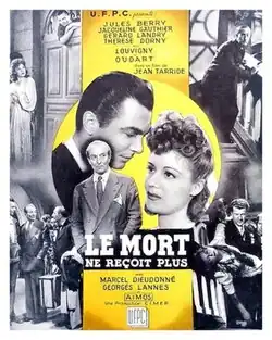 Death No Longer Awaits (French: Le mort ne reçoit plus) is a 1944 French crime film directed by Jean Tarride and starring Jules Berry, Jacqueline Gauthier and Gérard Landry.[1][2][3] It was shot at the Saint-Laurent-du-Var Studios and Victorine Studios in Nice. The film's sets were designed by the art director Georges Wakhévitch.