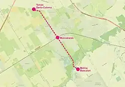 The route led from the Tomás Santa Coloma station (built by the "Tranvía Rural" company, property of the Lacroze brothers to serve the mill) on today's Camino de Rio Hondo and the Camino de El Trébol through the village of Manzanares in a southeasterly direction. In the area of the Luján River the route crossed a high and narrow dam and several watercourses, in particular using a steel bridge over the Arroyo Las Flores. Finally, it crossed the Luján River on a brick dam and ended at the Bancalari mill.[2][6]