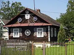 In the Podlachia region, especially in the Bielsk and Hajnówka counties, wooden residential houses are often architecturally decorated in their own style.[1] At the beginning of the 20th century, village buildings were still built according to the spatial layout of the Volok Reform that had been established since the 16th century. This tradition also included the layout of rooms and the shapes of buildings. The oldest preserved, decorated wooden houses in Podlachia date back to the beginning of the 20th century. The oldest ornaments preserved to this day date back to the years 1920–1940 and sometimes to the period up to the 1960s.[2]