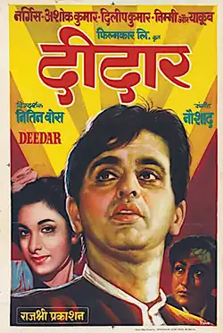 Deedar is a 1951 Hindi-language romantic musical film directed by Nitin Bose, starring Nargis, Ashok Kumar, Dilip Kumar and Nimmi. It is a story of unfulfilled love, where the hero's childhood love is separated from him due to class inequalities. It is one of noted tragedies made in early Hindi cinema. It became a popular film of the Golden era and further established Dilip Kumar as the "King of Tragedy".[1][2]