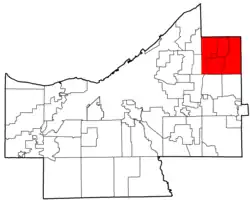Newburgh Township was organized on 15 October 1814, some years after the settlement of Newburgh had been established. Originally, the area's natural resources were significant enough that Newburg was the leading settlement in Cuyahoga County, causing Cleveland to be referred to as "the town on the lake, six miles from Newburgh," although Cleveland's location on Lake Erie soon led to its dominance.[17] Cleveland first annexed part of Newburgh Township in 1867 and continued to expand through the next several decades, eventually absorbing the village of Newburgh and most of the rest of the township by 1905.[18] The village of Newburgh Heights was incorporated in 1904, although it has since been reduced in area significantly.[19] Today, Newburg Township is divided between four cities and three villages: Brooklyn Heights, Cleveland, Cleveland Heights, Cuyahoga Heights, Garfield Heights, Newburgh Heights, and Shaker Heights.[20]