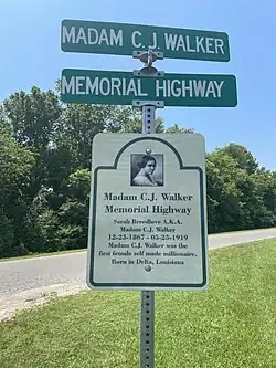 Sign for the Madam C.J. Walker Memorial Highway in Delta, Louisiana