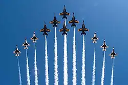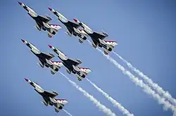 The delta formation was made famous by the United States Air Force's Air Demonstration Squadron, the Thunderbirds. When the Thunderbirds fly in a delta formation all six of the squadron's airplanes fly in a tight delta. In close formation the aircraft can have as little as 0.5 meters (1.5 feet) of separation between them.[5]