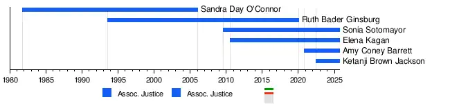 Of the 116 justices, 110 (94.8 percent) have been men. All Supreme Court justices were males until 1981, when Ronald Reagan fulfilled his 1980 campaign promise to place a woman on the court,[75] which he did with the appointment of Sandra Day O'Connor. O'Connor was later joined on the court by Ruth Bader Ginsburg, appointed by Bill Clinton in 1993. After O'Connor retired in 2006, Ginsburg was joined by Sonia Sotomayor and Elena Kagan, who were successfully appointed to the court in 2009 and 2010, respectively, by Barack Obama.[76] In September 2020, following Ginsburg's death, Donald Trump nominated Amy Coney Barrett to succeed her.[77] Barrett was confirmed the following month. Only one woman, Harriet Miers, has been nominated to the court unsuccessfully. Her 2005 nomination to succeed O'Connor by George W. Bush was withdrawn under fire from both parties, and also marked the first time when a woman was nominated to replace another woman on the court. The nomination of Barrett was the first successful nomination for a woman to succeed another woman. Joe Biden's 2022 nomination of Ketanji Brown Jackson to a seat vacated by the retirement of Stephen Breyer makes Jackson the first African-American woman to be nominated to the court.[41] The Senate confirmed Jackson on April 7, 2022, and she joined the court two months later.[42]