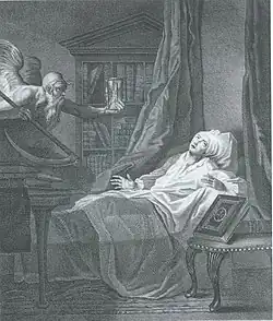 Just outside the entrance to the wood was a small hermitage known as The Temple of Death.[12] It had a thatched roof and internal enclosures formed by fake stonework panels,[15] each covered in verses reminding the reader of "the vanity, the shortness and insufficiency of human pleasures".[16] To the right-hand side of the temple entrance, hidden out of sight, was a clock that chimed every minute, which in the words of William Bowyer, was "admonishing us that Time is fleeting, and even the least portion of it to be employed in reflections on Eternity";[16][17] it was faced on the opposite side by a large white raven with a label in its mouth conveying the same message.[12] Chained to a sloping desk in the centre of the temple was a copy of Edward Young's poem Night-Thoughts and Robert Blair's The Grave, bound in black leather.[12]