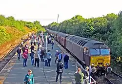 An excursion from Preston to Buxton hauled by West Coast Rail Class 57 57313 at the Stockport-bound platform in September 2016