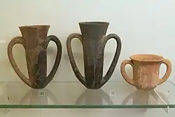 The basic form of these vessels consists of a tall, narrow beaker with a round base and two large handles opposite each other, which are attached close to the base of the vessel, and close to the edge of the vessel. There are hand-made and wheel-made specimens. Some are tapered at the bottom and others have a flat base.