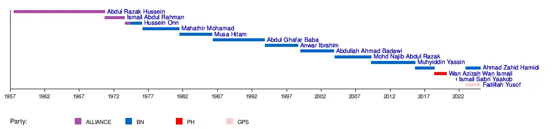 Ismail Abdul Rahman died in office due to massive heart attack in 1973.[3] Musa Hitam resigned from second Mahathir cabinet over differences with Prime Minister over government policy in 1986. Ghafar Baba resigned from his portfolio following UMNO grassroots lost confidence in his leadership and his position as Deputy President of UMNO was challenged by Anwar Ibrahim in the UMNO's top leadership election. Anwar Ibrahim was the first deputy prime minister to be sacked after being accused and subsequently charged with corruption and sodomy in 1998. Muhyiddin Yassin was the second DPM to be removed from office after being dropped from the Cabinet by former Prime Minister Najib Razak in a reshuffle in 2015.[4] He later was sacked from his party.[5] Wan Azizah Wan Ismail's role as deputy prime minister ended after the seventh Mahathir cabinet was dissolved due to its fall from the federal administration in 2020.