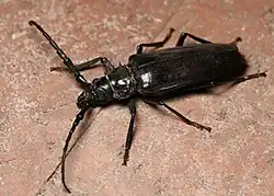 Derobrachus hovorei is a species of beetle in the family Cerambycidae,[1][2] known variously as the palo verde beetle, palo verde root borer, or palo verde borer beetle. For over 100 years, this species was confused with the related species Derobrachus geminatus, and only recognized and given its own name by Santos-Silva in 2007; essentially all literature prior to 2007 therefore incorrectly uses the name geminatus for this species.[3] It is a longhorn beetle native to the southwestern United States and northern Mexico which derives its common name from the palo verde tree, and it is one of the largest beetles in North America, reaching up to three and a half inches in length. Adults are black or brown in color, have long antennae, and spines on the thorax. They have wings and can fly, albeit awkwardly at times. Mature beetles emerge in the summer to mate. While not harmful to humans, they can bite in self-defense.[4]