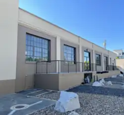 The original part of the building is a reinforced concrete structure on a rectangular base, measuring 50 feet along Desmet and 142 feet deep into the block, that rises four stories above a full basement. Interior structures such as columns, floors and stairways were made of reinforced concrete, as was the exterior. At the time, the new technology behind reinforced concrete was something to celebrate, so the exterior was not covered with a façade and the concrete was left exposed. An article published during the building's construction in The Spokesman-Review, Spokane's daily newspaper, echoed that sentiment, stating, "The concrete piers, the main structural members of the facade, will be rubbed smooth, but will be left in the natural concrete color and indicate frankly the strength and durability of the construction within."[12] The building's main entrance faced Desmet Ave. on the south face of the building, with a centrally located pair of wooden doors that have subsequently been replaced. On either side of the entryway are a pair of matching, large, rectangular metal sash windows. The three stories above feature matching windows, three per floor, separated by concrete piers. Between the first and second story is a simple concrete cornice. A concrete parapet runs along the roofline on the southern face.[12] The east and west faces were initially plain and windowless, but the east face had windows matching those on the front and back sides of the building added during the adaptive reuse redevelopment.[12]