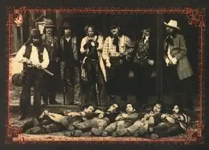On the back of the album is an image of all four members of the band together with Jackson Browne and JD Souther lying dead and bound on the ground. A posse stands over them, including the producer Glyn Johns (far right in a white hat), manager John Hartmann, road manager Tommy Nixon, artist Boyd Elder (who would be responsible for the skull artwork of Eagles' later albums), roadies, and Gary Burden (far left).[22] The photo is meant to be a reenactment of the historical image of the capture and death of the Dalton Gang.[20] Jackson Browne said that the image on the back cover with the musicians lying dead is when the "whole thing really comes together".[7]