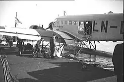 In 1933, Thomas S. Falck was appointed director of Bergenske Dampskibsselskab (BDS).[7] Fred. Olsen wanted a partner for DNL, in part to strengthen its geographic spread, and meetings were held between Olsen family and Falck to introduce the Bergen-based company as a partner in DNL. On 7 November 1934, Bergenske became a partner in DNL, and the company renamed Det Norske Luftfartselskap Fred. Olsen og Bergenske A/S. Johan Wulfsberg from BDS became a board member of DNL. As a reply to DNL's new concession application to make short-term sea plane routes using a Junkers Ju 52, the government urged DNL to make an alliance or merger with Widerøe. By then, four regional shipping companies—Vesterålske, Nordenfjeldske, Stavangerske and Arendalske—had bought the majority of Widerøe.[8]