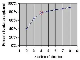 The elbow method looks at the percentage of explained variance as a function of the number of clusters: One should choose a number of clusters so that adding another cluster does not give much better modeling of the data. More precisely, if one plots the percentage of variance explained by the clusters against the number of clusters, the first clusters will add much information (explain a lot of variance), but at some point the marginal gain will drop, giving an angle in the graph. The number of clusters is chosen at this point, hence the "elbow criterion". In most datasets, this "elbow" is ambiguous,[1] making this method subjective and unreliable. Because the scale of the axes is arbitrary, the concept of an angle is not well-defined, and even on uniform random data, the curve produces an "elbow", making the method rather unreliable.[2] Percentage of variance explained is the ratio of the between-group variance to the total variance, also known as an F-test. A slight variation of this method plots the curvature of the within group variance.[3]