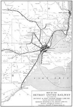 The Detroit United Railway was a transport company which operated numerous streetcar and interurban lines in southeast Michigan. Although many of the lines were originally built by different companies, they were consolidated under the control of the Everett-Moore syndicate, a Cleveland-based group of investors. The company incorporated on December 31, 1900, and continued to expand into the early 1920s through new construction and the acquisition of smaller concerns. After the DUR acquired the Detroit-Jackson line in 1907, it operated more than 400 miles (640 km) of interurban lines and 187 miles (301 km) of street city street railway lines.