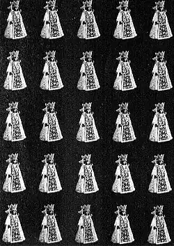 Schluckbildchen had a square, rectangular or round shape and a feed size of 5 to 20 mm. So they were the smallest form of devotional art design. Small pictures of the 19th century were partly bigger, like the version that was produced in Einsiedeln (32x22 mm). Also Schluckbildchen were produced on light sheets of paper; one sheet could hold 130 pieces. Both possible were series of one theme as well as different themes which would always have the same style. Schluckbildchen can be detected after the middle age.[3] Up to the 19th century copper engraving printings were most likely, including some notes (for example in Mariazell) which were produced with a woodcarving technique. Later, colour printing was used; in the 20th century also photomechanical reproduction of old artworks.