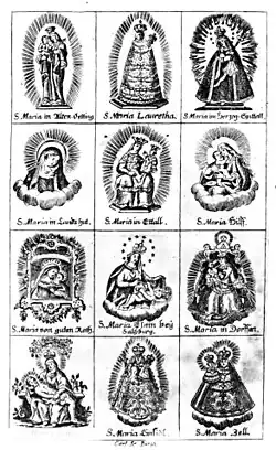 Schluckbildchen often show the Virgin Mary as a picture of mercy in a specific pilgrimage location, sometimes other saints or portrayals from Christian iconography, like the Nomen sacrum or Titulus INRI. Usually, under the theme an inscription is placed naming the location of pilgrimage or the saint that is portrayed. Frequently, someone made the effort also to put on details of the devotional art design. The symmetry of the rectangular, triangular, diamond-shaped, round or elliptical-shaped frame elements concentrated the effect of the picture on the central theme. Also effects like rays of light as well as the floating on clouds put emphasise on the transcendental character of the picture.[4]