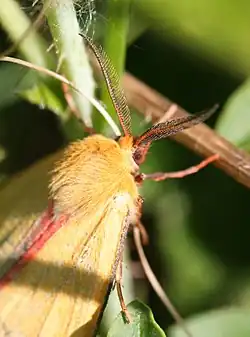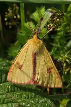 The wingspan is 35–50 mm. The forewing of the male is lemon yellow, and the hindwing is ivory yellow, both wings with a greyish red median spot and pink margin. In the female the body and wings are suffused with brownish red. In pallida Stgr., which occurs constantly in Central Asia and aberratively also in Europe, the black colour is reduced. In irene Butl. (now full species Diacrisia irene Butler, 1881), which occurs in Japan and locally also elsewhere in the Palearctic region, and is regarded by Matsumura as a separate species, the black colour is absent on the hindwing of the male and the median spot on the forewing is generally reduced. In uniformis Stgr. (D. s. mortua (Staudinger, 1887)) from Syr-Darja, the last trace of black and pink has disappeared, so that extreme specimens of this form are quite uniformly pale yellow on both sides of the wings and body. In specimens from Ferghana, the Issyk-kul and the neighbouring countries further east in Central Asia, the red inner margin of the forewing is entirely absent, the black on the hindwing being however present. This is the form mortua Stgr. (D. s. mortua (Staudinger, 1887)). Further eastward, at the Amur, a form occurs with very sharp black markings, and with the ground colour of the hindwing strongly tinged with reddish, amuri Butler, 1881 Stgr.[1]