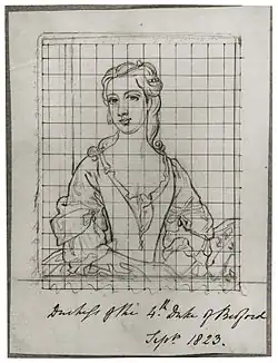 The Duchess's grief-stricken grandmother reread and burned all the Duchess's letters,[1] and accused her widower of being responsible for her death.[5] Despite her "contempt for ostentatious piety" and "her religious doubts", the Dowager Duchess of Marlborough reportedly prostrated herself on the floor of Marlborough House in prayer upon the death of her favourite grandchild.[1][9] She had become estranged from all her surviving daughters, and the Duchess of Bedford was her only grandchild who never disappointed her.[10] Lord Hervey, however, accused the Dowager Duchess of caring more about the return of her granddaughter's jewels, which she demanded back from the Duke even before the Duchess was buried.[4] The Duchess of Bedford's lead-lined coffin was placed on a gun carriage and taken through the streets.[1] She was buried on 9 October 1735 at Chenies, Buckinghamshire.[4] Her death removed her grandmother's link with the Duke of Bedford, leading to a considerable diminishment in the latter's influence.[2]