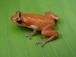 Adult males measure 17–22 mm (0.7–0.9 in) and adult females 21–25 mm (0.8–1.0 in) in snout–vent length.[5] The head is as wide as the body and longer than it is wide. The snout is long, and subacuminate in dorsal view, and truncate in lateral view. The tympanum has its upper edge hidden by the low, poorly defined supra-tympanic fold. The fingers have weak lateral keels and small discs. The toes are basally webbed and have lanceolate discs. Dorsal skin is smooth but may have low tubercles in some specimens. The dorsum is yellowish-tan with yellow flanks. There are some reddish brown dorsal markings: an inter-orbital bar, narrow canthal and broader post-orbital stripes, as well as smaller markings in the scapular region and on the shanks. The iris is golden bronze and has a reddish-brown horizontal streak.[6]
