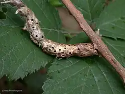 Some herbivorous insects create their own microhabitats by forming an abnormal growth, in this case a gall. Both upright and prostrate stems can be galled and they are often low down and hidden by vegetation. They tend to be most noticeable in the winter when brambles have lost some of their foliage. The gall is an elongate swelling in the stems of brambles; 2–15 cm long and circa 1 cm wide. They are often curved or they cause the stem to bend and can contain up to 200 spherical swellings. Each swelling is a chamber containing a white wasp larva. Larvae overwinter in the gall and adults emerge the following spring. Galls can remain on the plants for many years, are often silvery and numerous exit holes can be seen.[2][3]