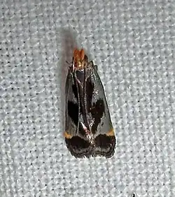 The length of the forewings is 5.4–6.5 mm (0.21–0.26 in).[4] The forewings are deep brown, with a steel-blue, shining streak along the costa, extending from the base to an orange-yellow costal spot at the beginning of the apical cilia, and deeply excised in the middle of the wing. Beneath the excised portion and near the inner margin is a short, steel-blue streak, and the costal streak emits a slender line to the inner margin, opposite the costal orange-yellow spot. The hindmargin has a series of steel-blue dots. The hindwings are fuscous.[5] Adults are on wing from June to August.