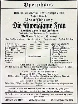 The fact that Zweig was a Jew was causing potential problems for the performance of the opera: in the summer of 1934 the Nazi press began to attack Strauss on this issue. Zweig recounts in his autobiography that Strauss refused to withdraw the opera and even insisted that Zweig's authorship of the libretto be credited; the first performance in Dresden was authorized by Hitler himself. Subsequent research has shown that Zweig's account is largely correct.[2][3] We now know that there was an internal power struggle going on within the Nazi government. Joseph Goebbels wanted to use Strauss's international reputation and was willing to relax the rule against works with non-Aryan artists. However, Alfred Rosenberg was more critical of Strauss's unsoundness on the "Jewish question" and wanted to remove Strauss from his position and replace him with party member Peter Raabe. Goebbels took the matter to Hitler, who initially ruled in his favour. However, the Gestapo had been intercepting the correspondence between Strauss and Zweig, in which Strauss had been candid about his critical views of the Nazi regime and his role in it.[4] This letter was shown to Hitler, who then changed his mind. The opera was allowed to run for three performances and then banned. On 6 July 1935, Strauss was visited at his home by a Nazi official sent by Goebbels and told to resign from his position as president of the Reichsmusikkammer on grounds of "ill health", less than two years after he had taken up the post. He was replaced by Peter Raabe, who remained in place until the fall of the Nazi regime. Although banned in Germany, the opera was performed a few times abroad, including in Milan, Graz, Prague and Zürich.[5][6] This would not the first time one of his operas had been banned: Kaiser Wilhelm had banned Feuersnot in 1902. Indeed, the propensity of totalitarian regimes to ban operas was not limited to Germany: a few months later in early 1936 Dmitri Shostakovich's opera Lady Macbeth of Mtsensk was banned by the Soviet regime. Zweig and Strauss continued to work together secretly (with Joseph Gregor), mainly on the libretto for the opera Friedenstag which was premiered in 1938. The story was almost wholly Zweig's, but the ideal of pacifism which it embodied was dear to both.