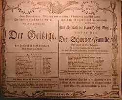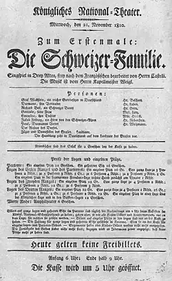 Die Schweizer Familie (The Swiss Family) is an opera by the Austrian composer Joseph Weigl. It takes the form of a Singspiel in three acts. The libretto, by Ignaz Franz Castelli,[1] is based on the vaudeville Pauvre Jacques (1807) by Charles-Augustin de Basson-Pierre, known as Sewrin, and René de Chazet. The opera was first performed at the Theater am Kärntnertor, conducted by the composer, in Vienna on 14 March 1809 and was a great success in German-speaking countries in the early 19th century.