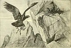 Golden eagles, being habitual scavengers at carrion, come into conflict with scavenging birds as well. They may encounter corvids at carrion sites and the large passerines are often highly cautious, either feeding some distance from the eagle or waiting until the eagle is done eating, lest they be predaceously grabbed.[10] Occasionally, however, corvids may behave more boldly around golden eagles. In one case, a group of three black-billed magpies were observed to rob a golden eagle of its prey.[181] Golden eagles also usually dominate both New World and Old World vultures. Smaller species like black vulture (Coragyps atratus) in North America and Egyptian vulture (Neophron percnopterus) in Eurasia are known to be occasionally hunted by golden eagles.[182][183] Besides the Steller's sea eagle, the larger species of Old World vulture and the California condor (Gymnogyps californianus) are the only noticeably larger raptorial birds that a golden eagle may encounter. The relationship between these large vultures and golden eagles can be highly contentious, with most sources favoring victory for the eagle due to its more aggressive disposition, much stronger feet and sharp talons. In one case, a colony of griffon vulture (Gyps fulvus) was exceptionally able to displace a pair golden eagles from a cliff where they were trying nest so they could nest there themselves.[184] On the other hand, a 5-year-old griffon vulture reintroduced into the wild in Bulgaria was thought to have been killed by a golden eagle.[185] The golden eagle is a potential predator of the lammergeier which is often attracted to much the same habitat and prey as the eagle but often feeds largely on bone marrow from carcasses.[186] It has been observed that both golden eagles and lammergeiers will readily pirate food away from each other.[187] In the Southwestern United States, several conflicts between huge California condors and golden eagles have been observed. At carrion, victory during conflicts can go either way apparently.[188][189][190] Recent observation have suggested that the critically endangered condors do not seem to actively defend their nesting territories from golden eagles but have been recorded gaining incidental protection from prairie falcons and common ravens, which both aggressively displaced the eagles from their own adjacent territories.[191] The golden eagle is considered an occasional predator of California condors (especially fledglings) but there seems to be little in the way of eyewitness accounts to confirm this. It is possible that (as in the Bulgarian griffon vultures) the California condors have lost their natural cautiousness around eagles due to having been reintroduced from captivity.[192]