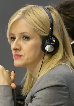 Vukomanović's term as an SPS vice-president came to an end in September 2015, and she became chair of the party's executive committee.[16] She received the sixth position on the Socialist Party's electoral list for the 2016 parliamentary election and was elected for a third term when the list won twenty-nine mandates.[17] The Progressives won another majority victory, and the SPS continued as part of the country's coalition government. There were rumours that Vukomanović would be appointed to a cabinet position, though ultimately this did not occur.[18] She continued to lead the SPS's assembly group and was the leader of Serbia's delegation to the OSCE PA, a member of the foreign affairs committee, and a deputy member of the European Union–Serbia stabilization and association committee.[19][20]