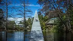 New Zealand artist David McCracken designed the sculpture to be constructed from welded aluminum. The dimensions of the structure are 12 metres (39 ft) x 1.45 metres (4.8 ft) x 3.8 metres (12 ft).[6] It is installed in Christchurch Botanic Gardens in Kiosk Lake. It is a stairway sculpture which is meant to be an optical illusion. The illusion is achieved due to wider steps at the bottom of the sculpture which gradually decrease in size with each step until they come to a vanishing point at the top.[1] The steps at the top are just a few centimeters wide.[7] When viewed from certain angles it appears to be an endless stairway.[2]
