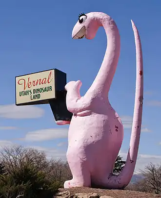 The statue weighs 4,200 pounds (1,900 kg) and is composed of steel and pink fiberglass.[3] It was originally built in 1958 to hold a sign for the Dine-A-Ville Motel[4] and served this purpose until the motel went out of business and was demolished.[5] It was later moved to a city park in the eastern part of town and now holds a sign welcoming visitors that reads "Vernal—Utah's Dinosaur Land".[6][7]